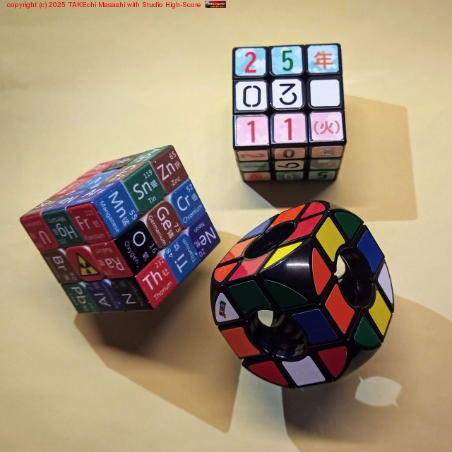 ここ最近のお気に入り。中心の無いボイドキューブと中心の向きを意識しないといけない元素周期表キューブ。どっちも 3x3x3+αで回していて楽しい。日めくりキューブは毎朝のルーチン♪