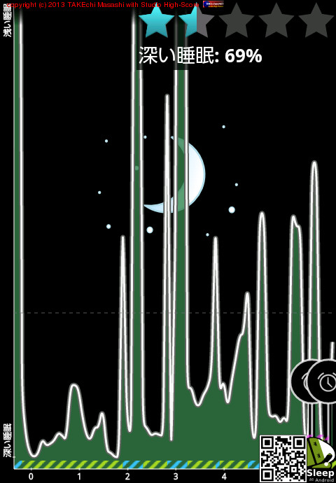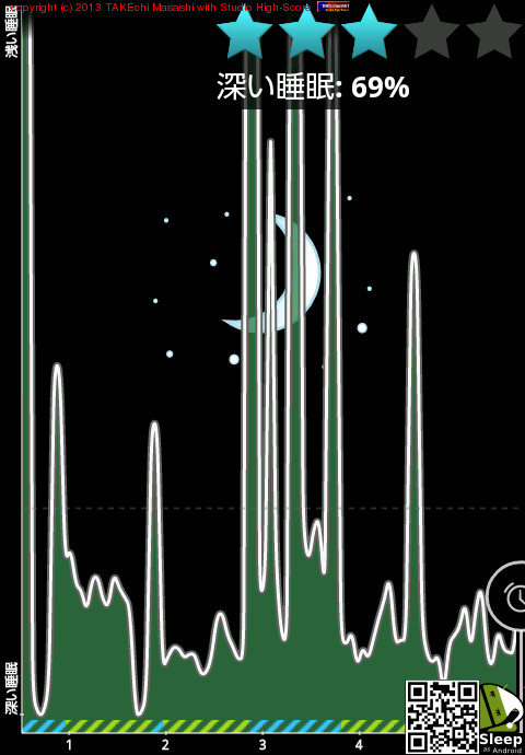04/08 23:38 → 04/09 6:19 (6:41) 深い睡眠: 69% (2時〜3時あたり起きてた)