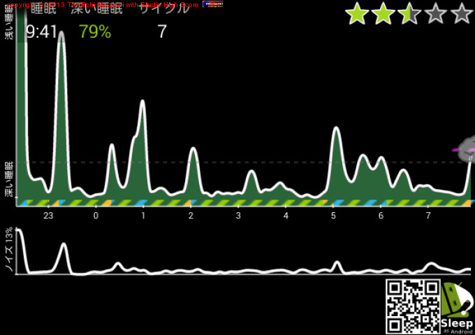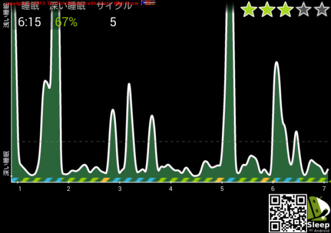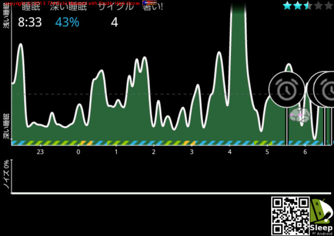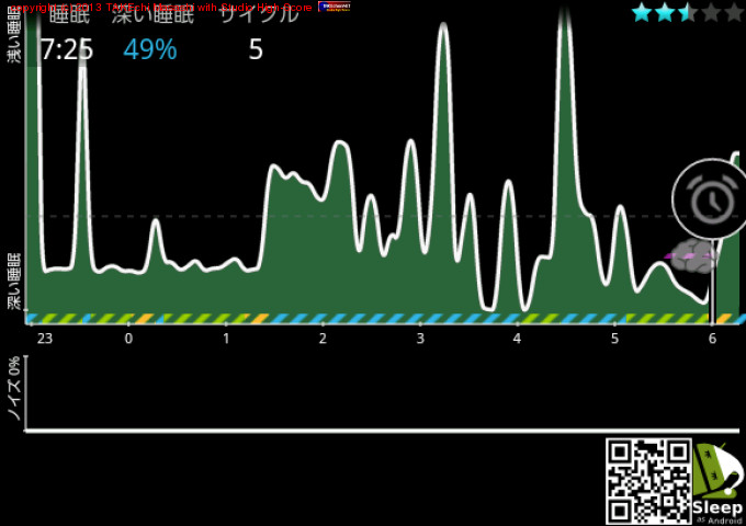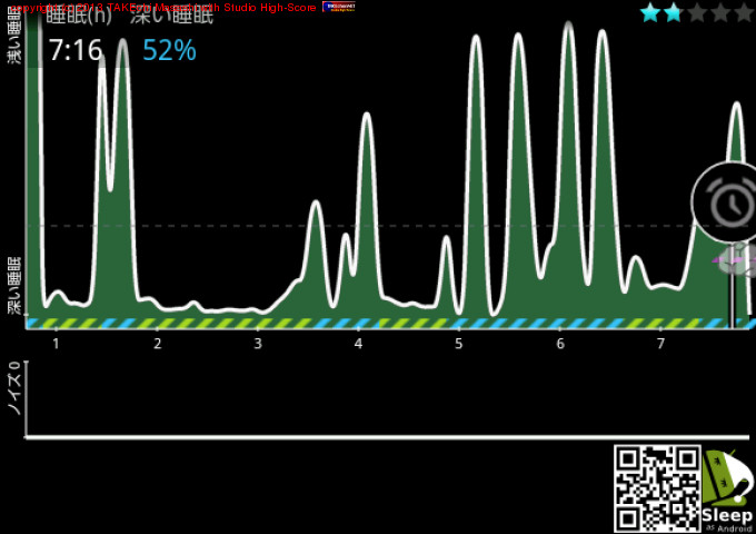 08/07 0:14 → 6:50 (6:36) 深い睡眠: 55% Cycles 3 6時半頃に起きていたが,止めるのを忘れていて 6:50 起床の記録になった。