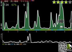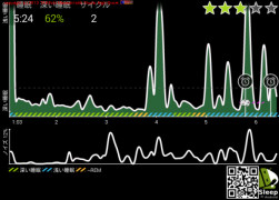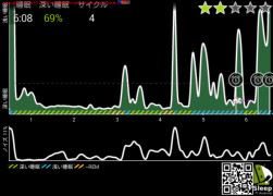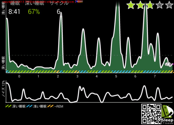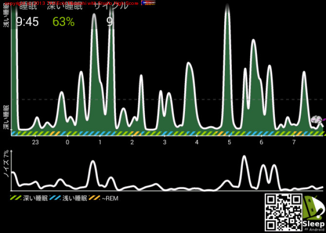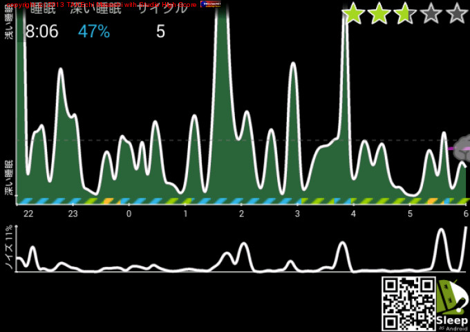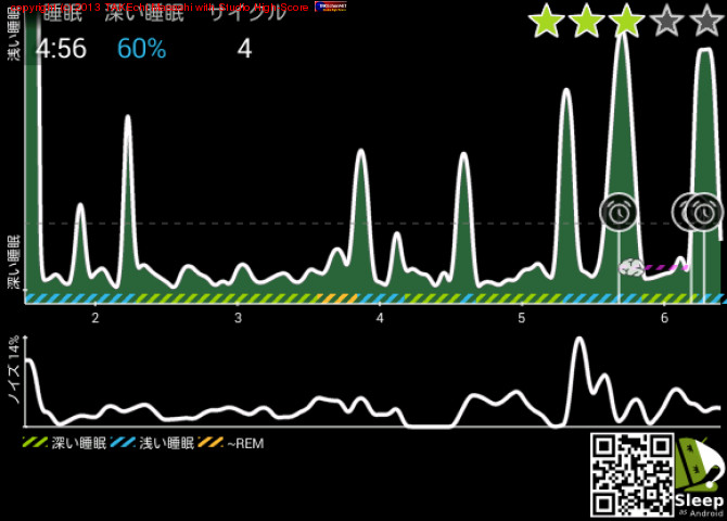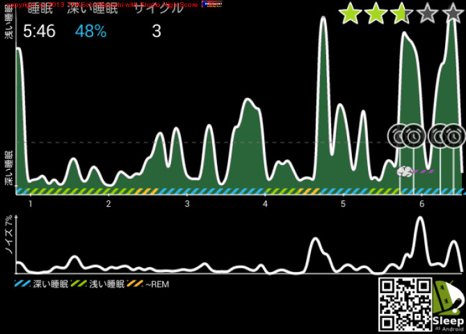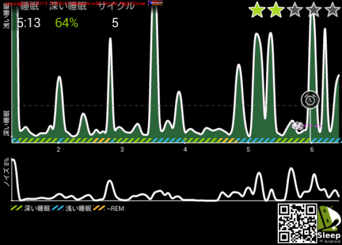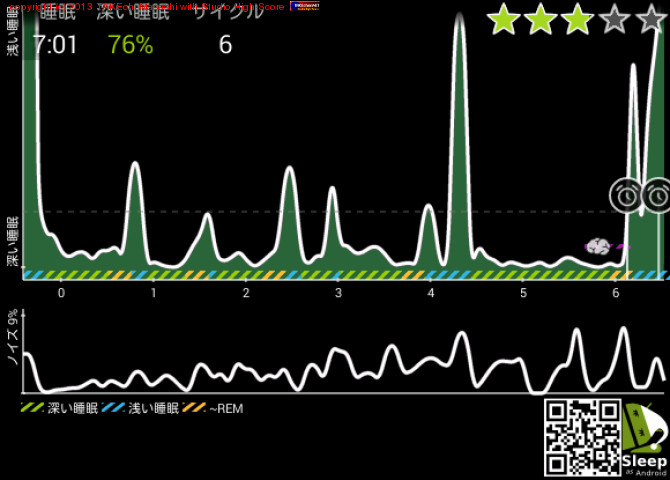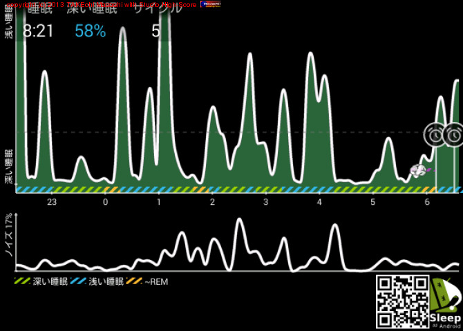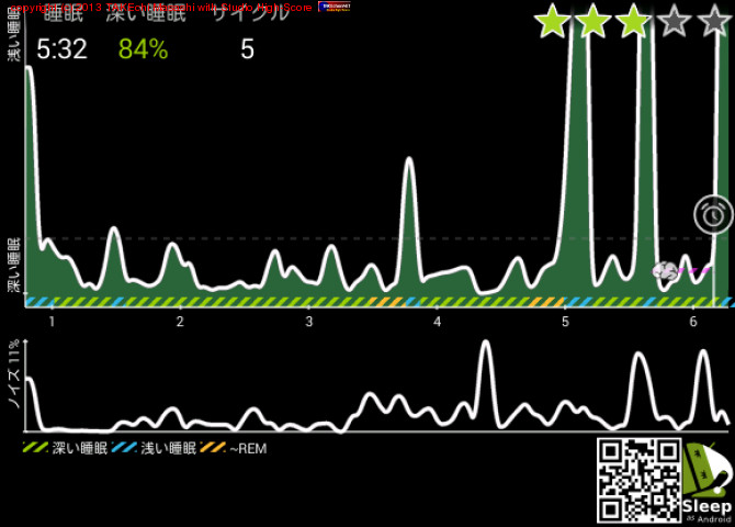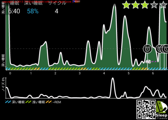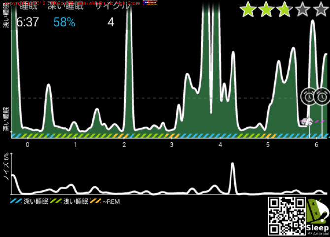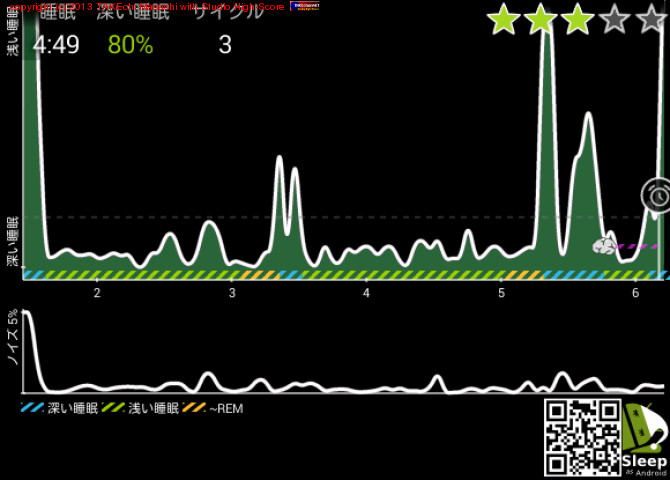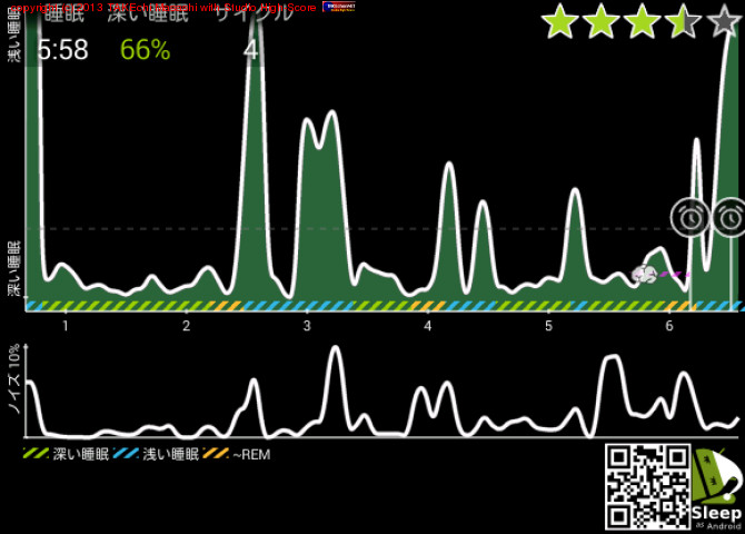 09/04 23:58 → 09/05 6:38 (6:40) 深い睡眠: 58% サイクル 4 4〜5時あたりの浅い睡眠 & ノイズは豪雨と雷!!