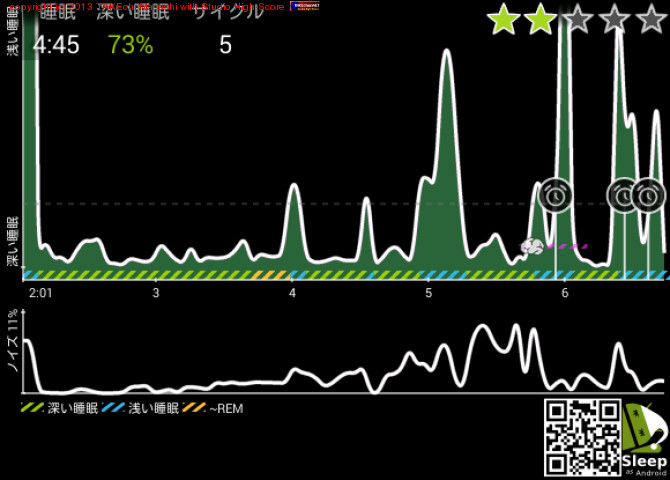 09/11 2:01 → 6:47 (4:45) 深い睡眠: 73% サイクル 5