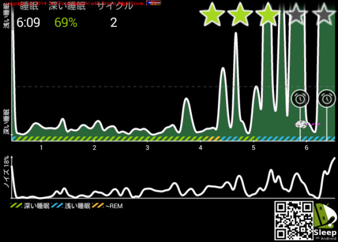 01/09 0:26 → 6:36 (6:09) 深い睡眠: 69% サイクル 2