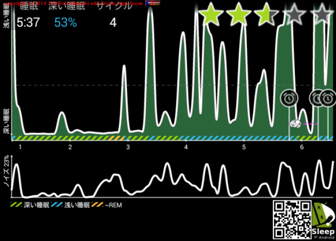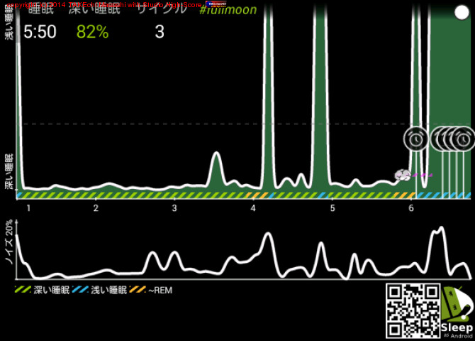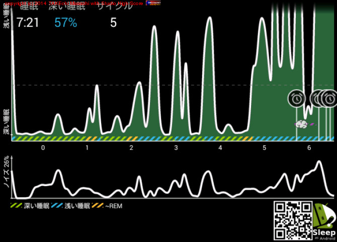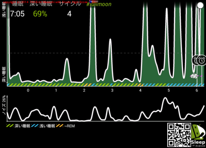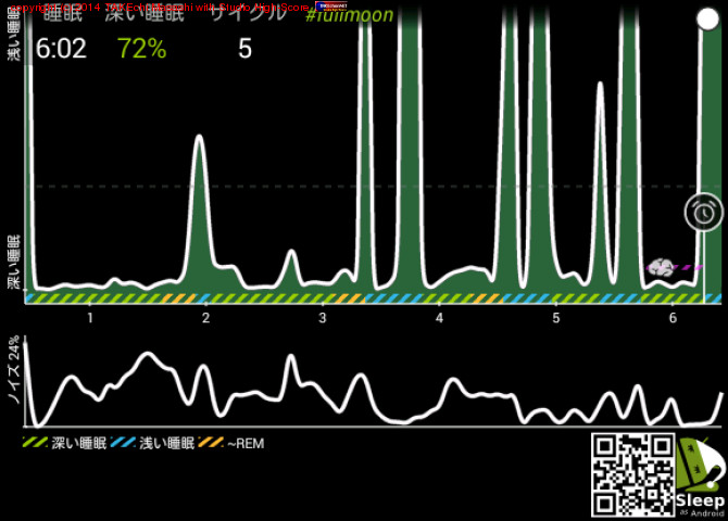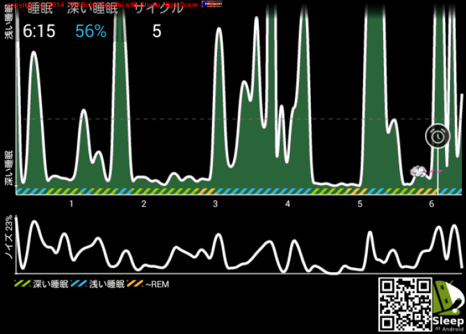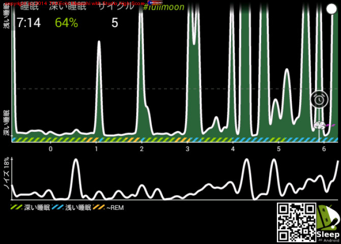 01/14 23:08 → 01/15 6:23 (7:14) 深い睡眠: 64% サイクル 5