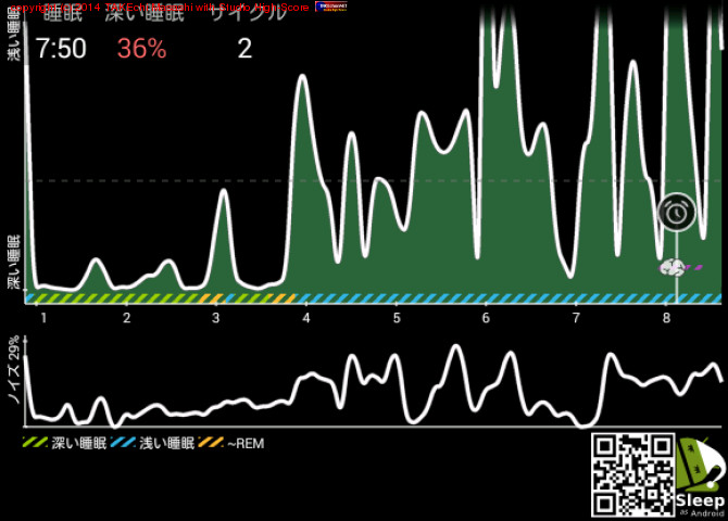 01/07 23:58 → 01/08 6:34 (6:36) 深い睡眠: 81% サイクル 5