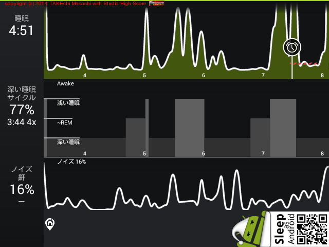 06/08 23:24 → 06/09 6:21 (6:57) 深い睡眠: 77% サイクル 8