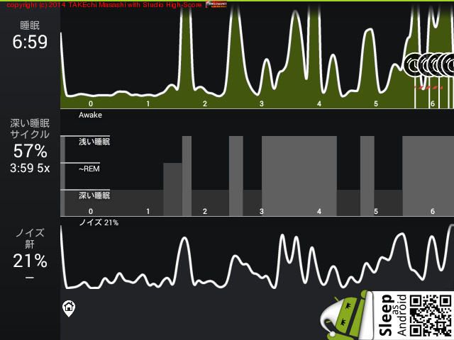 06/11 23:13 → 06/12 6:34 (7:21) 深い睡眠: 65% サイクル 7